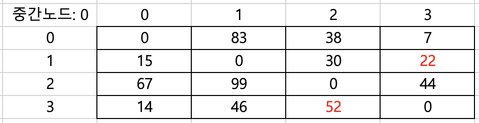 중간 노드로 0을 거쳐 갈 수 있다고 한다면 최단거리 갱신은 아래와 같이 이루어진다.