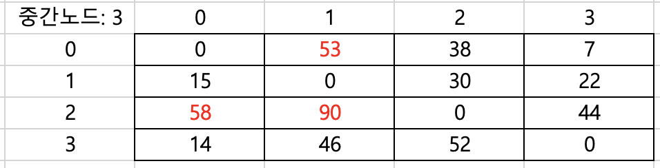 dist[3][2] = Math.min(dist[3][2], dist[3][0] + dist[0][2]); // (81, 14+38): 갱신