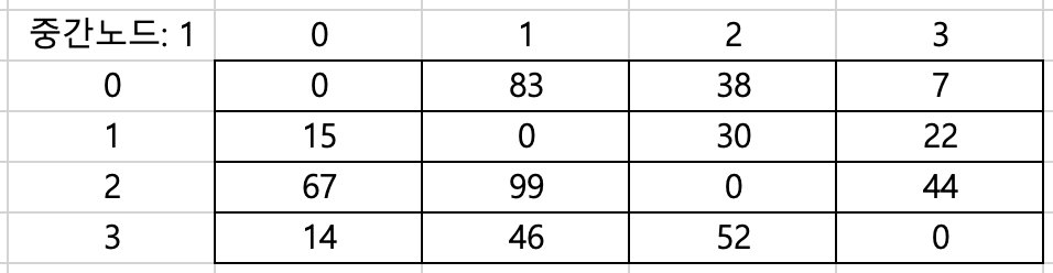 dist[0][1] = Math.min(dist[0][1], dist[0][3] + dist[3][1]); // (83, 7+46): 갱신