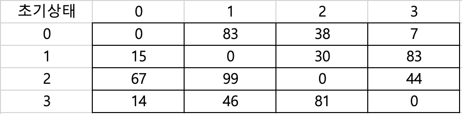 그래프의 상태가 위와 같다고 가정하고 알고리즘을 실행한다. 위 그래프를 2차원 배열로 나타내면 아래와 같다.
