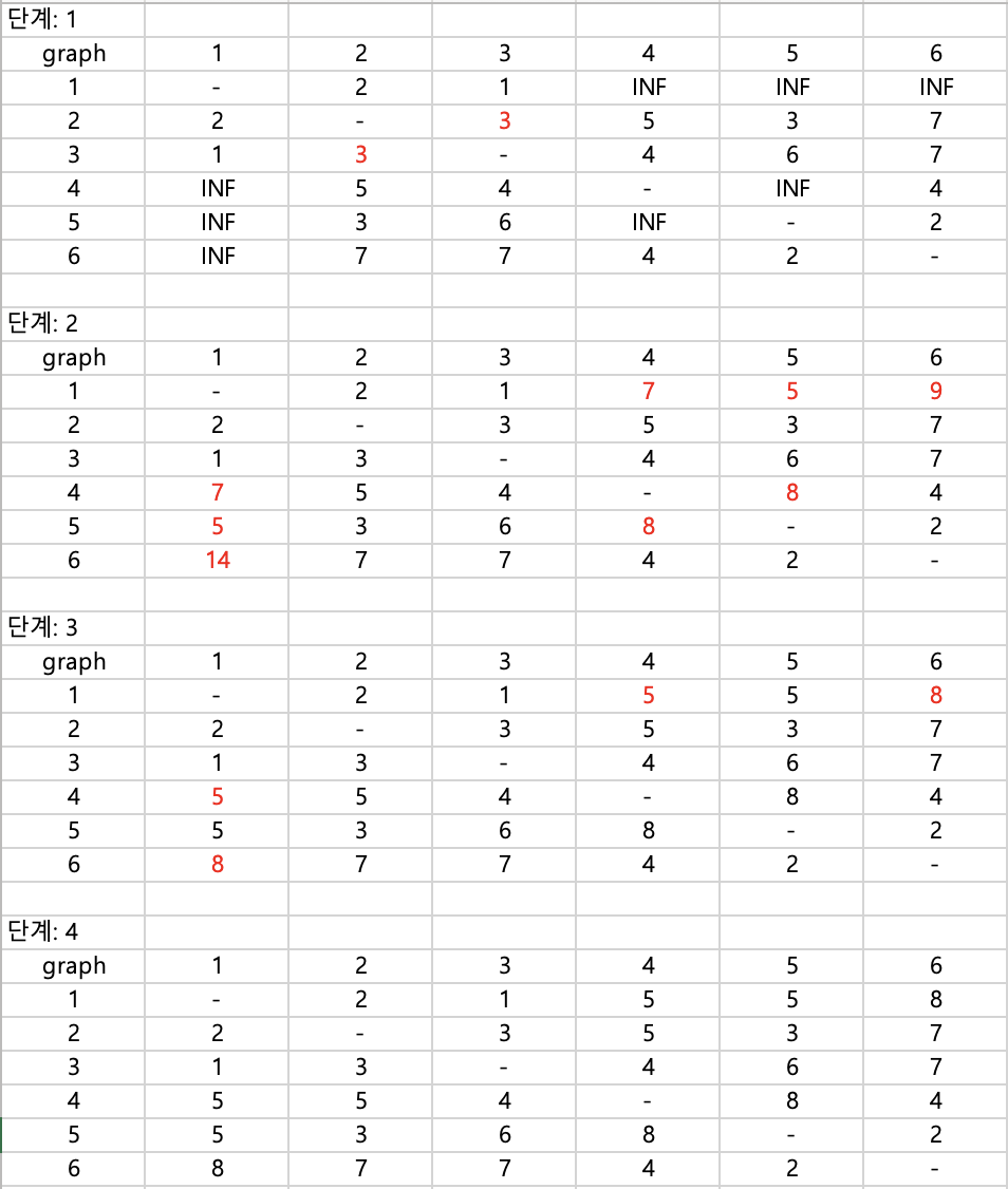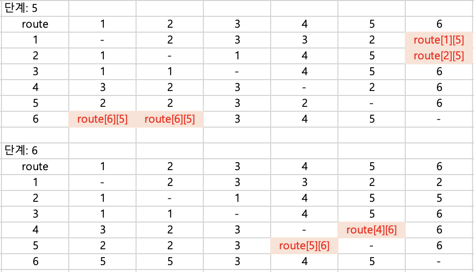 처음에 k로 갱신을 하면 되겠다고 생각을 했는데 문제 예제의 출력 결과 중에서 [1][6] 값이 다르게 나왔다.