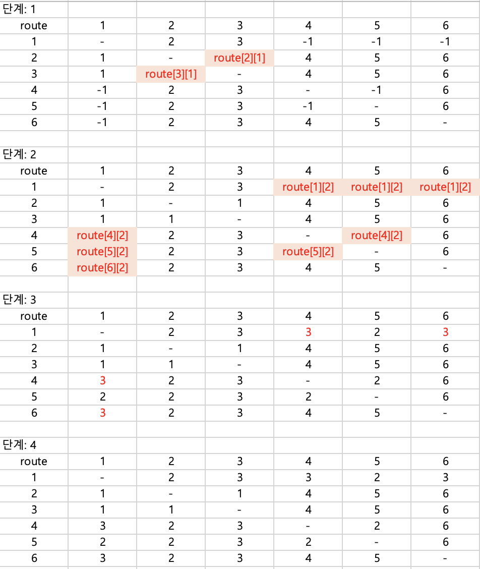 다만, 다른 플로이드 워셜 문제와는 다르게 비용을 구하는 것이 아닌 경로를 찾아야 하는 문제이다.