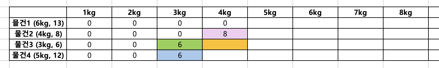 - 물건4를 고려했을 떄 물건을 넣을 수 없으므로 물건 3을 넣은 가치 그대로인 6이다.