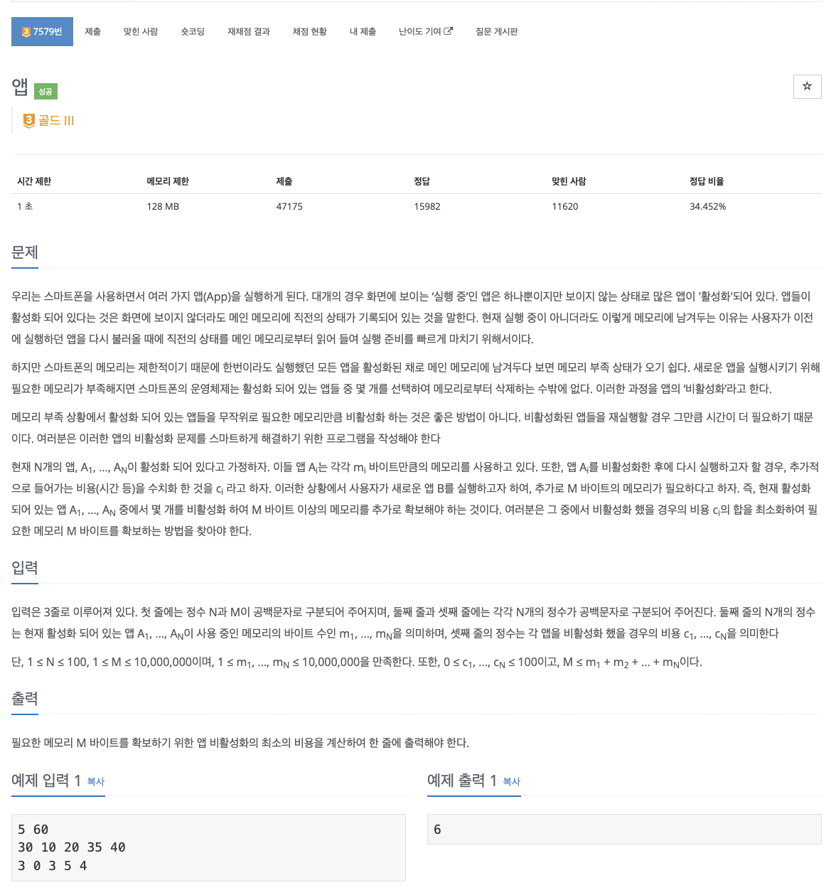 다만, 배낭 알고리즘에서는 배낭에 물건을 담아 최대한의 가치를 구하는 알고리즘인데 이 문제에서는 '앱을 비활성화 하는데에 필요한 비용'을 '배낭에 담을 수 있는 최대 무게' 로 생각해야 한다. 그리고 '앱을 비활성화하여 얻을 수 있는 메모리'를 '배낭에 담은 물건의 가치'로 생각해서 풀어야 하는 문제이다.