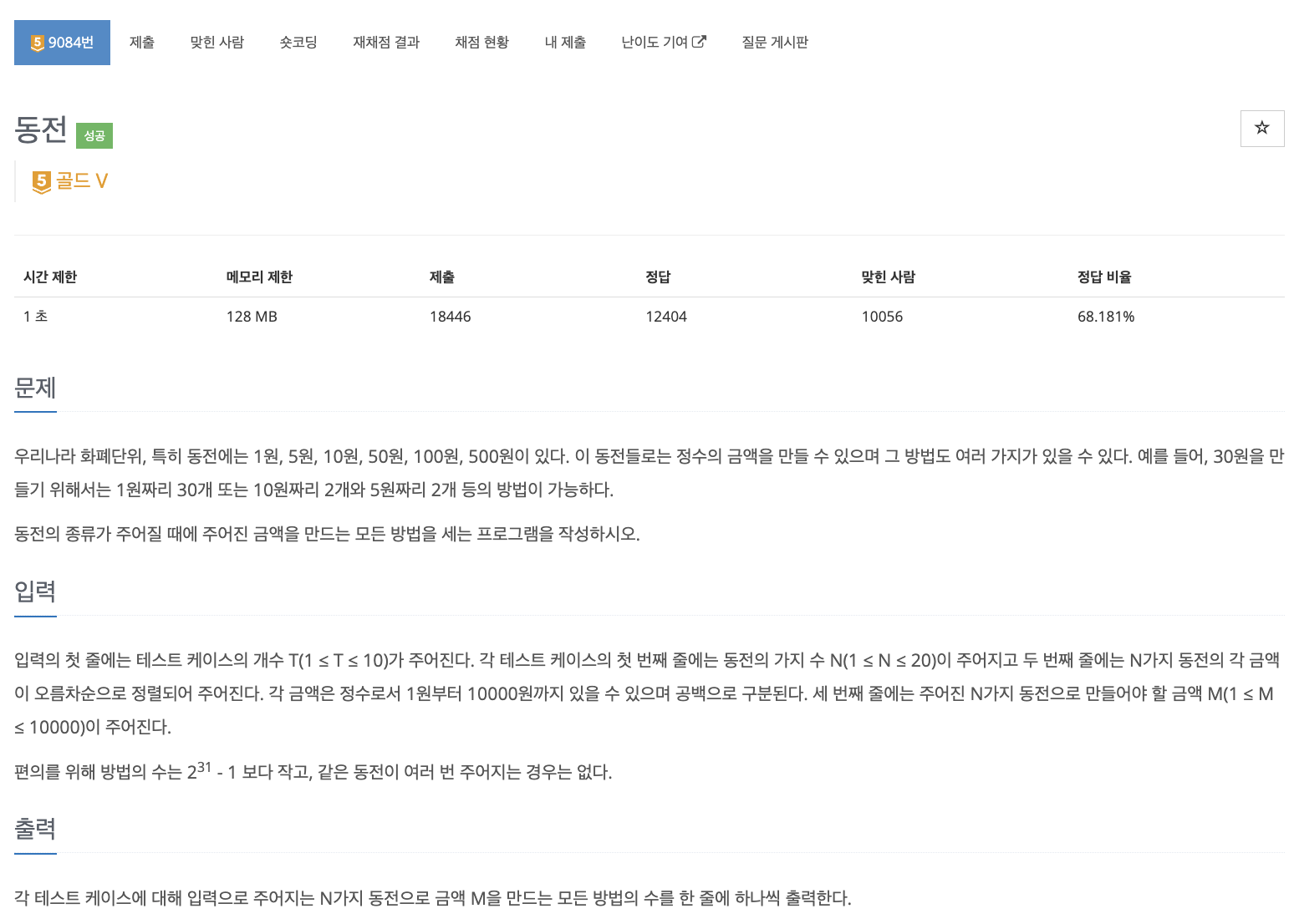 이 문제는 동전으로 금액 M을 만들 수 있는 모든 경우를 구하는 문제이다. 동전의 금액은 모두 다르며, 사용할 수 있는 동전의 개수에는 제한이 없다.
