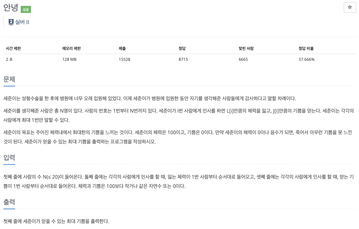 ※ 참고로 배낭문제는 물건을 여러번 쓸 수 있는 지 쓸 수 없는 지에 대해서 나뉜다. 이번 문제에서는 여러번 쓸 수 없으므로 인사를 할 수 있는 경우를 고려할 때, curJ + dp[n-1][j-curL] 부분에서 dp[n]이 아닌 dp[n-1]이다.